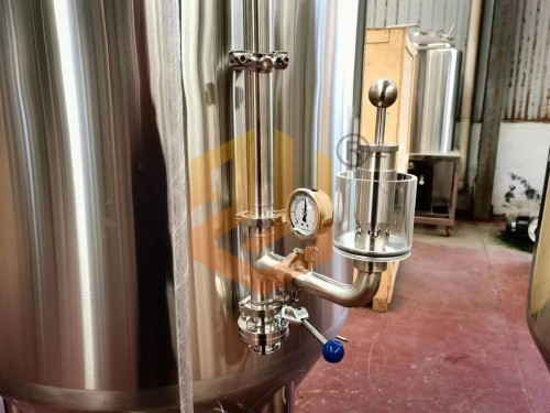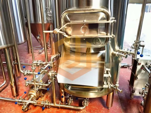 精釀啤酒設備使用的過(guò)濾槽與旋沉罐:采用上下兩層的設計方式,整體占地面積小,過(guò)濾槽采用銑制篩板,頂部采用異型人孔設計,側面配有出糟口,方形人孔門(mén)設計更有利于啤酒麥糟的清理工作,同時(shí)還配有出糟板。內部配有耕刀裝置,用于疏松麥糟層以及出糟使用。